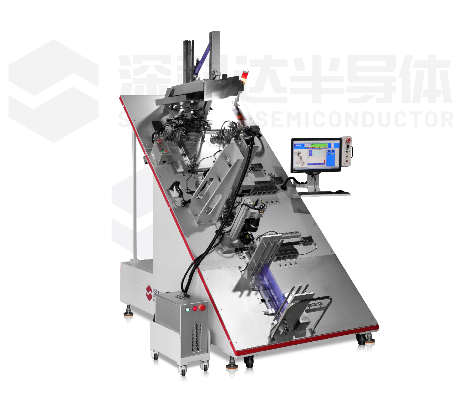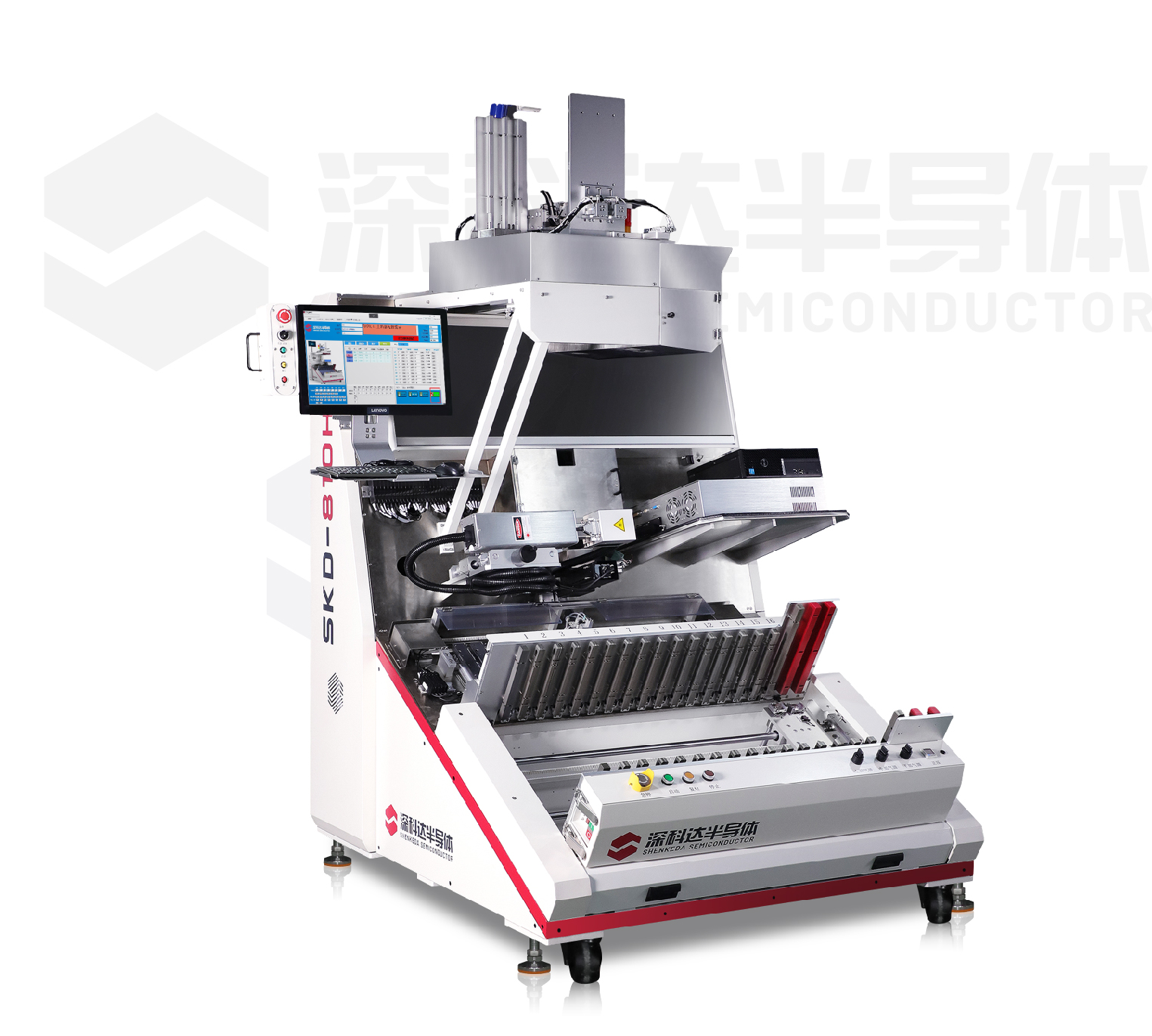 SKD831 gravity test handler: an automatic Handler designed for packaging and testing of IPM series products. The Handler adopts oblique back mode and integrates insulation test, electrical performance test, laser marking, brush dust removal and visual inspection.
