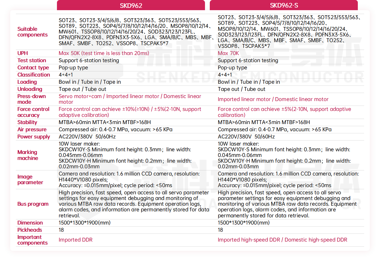 SKD962 is applicable for taping of discrete devices, IC devices, etc. It has high-speed test marking and taping capability and adopts high-precision DDR to ensure stable performance and high UPH output. Integration of marking system and vision system brings customers high quality product output.