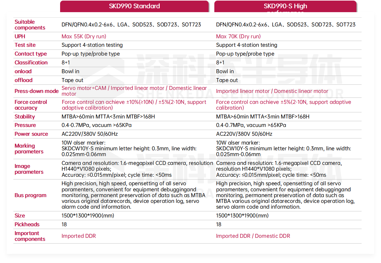 SKD990 turret test handler is applicable for testing and taping mini semiconductor components. It employs high-precision components and DDR to ensure stability and high UPH output. The integrated marking and vision systems deliver high-quality product output to customers.
