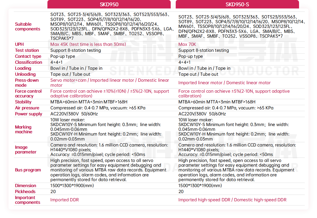 SKD950 is applicable for taping of discrete devices, IC devices, etc, and has the ability of high-speed test, marking and taping. It adopts high-precision DDR to ensure stable performance and high UPH output. Integrate the marking system and vision system to bring high-quality product output to customers.
