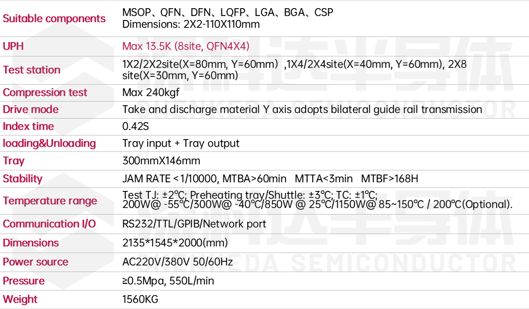 ● Temperature control system: Test TJ: ±2℃; Preheating tray/Shuttle: ±3℃; TC: ±1℃; 200W@ -55℃/300W@ -40℃/850W @ 25℃/1150W@ 85~150℃ / 200℃(Optional).