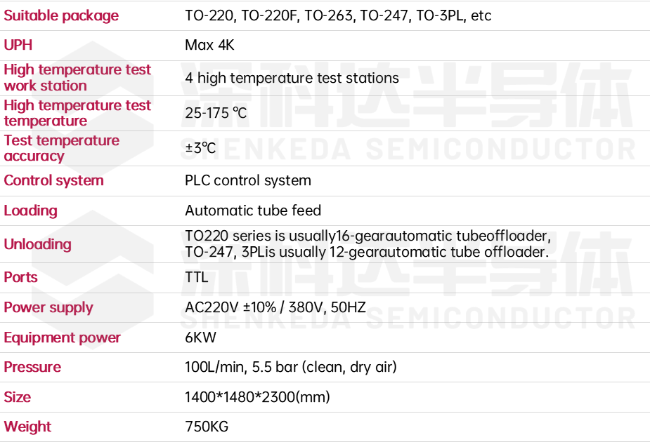 SKD811H gravity test Handler is a fully automatic that is designed for the testing of TO series packaging power devices.It has series connection of many test stations, which integrates insulation testing, conventional electrical performance testing, laser marking, brush dedusting, visual inspection and other functions.