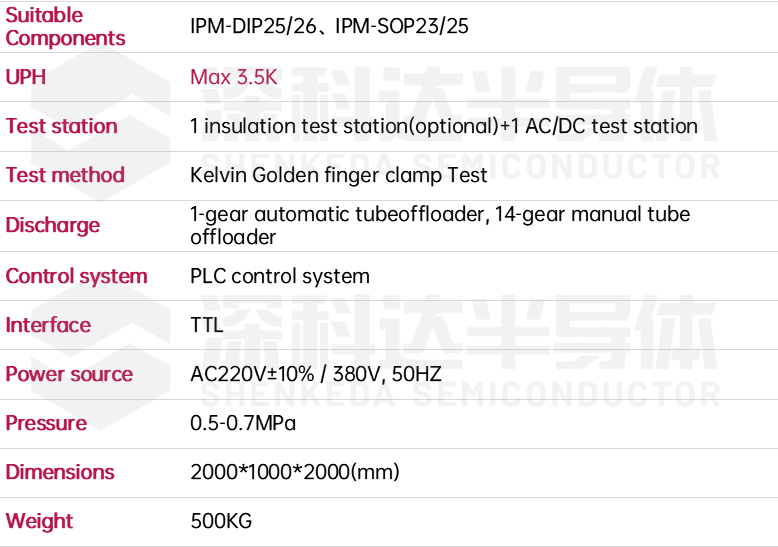 SKD831 gravity test handler: an automatic Handler designed for packaging and testing of IPM series products. The Handler adopts oblique back mode and integrates insulation test, electrical performance test, laser marking, brush dust removal and visual inspection.