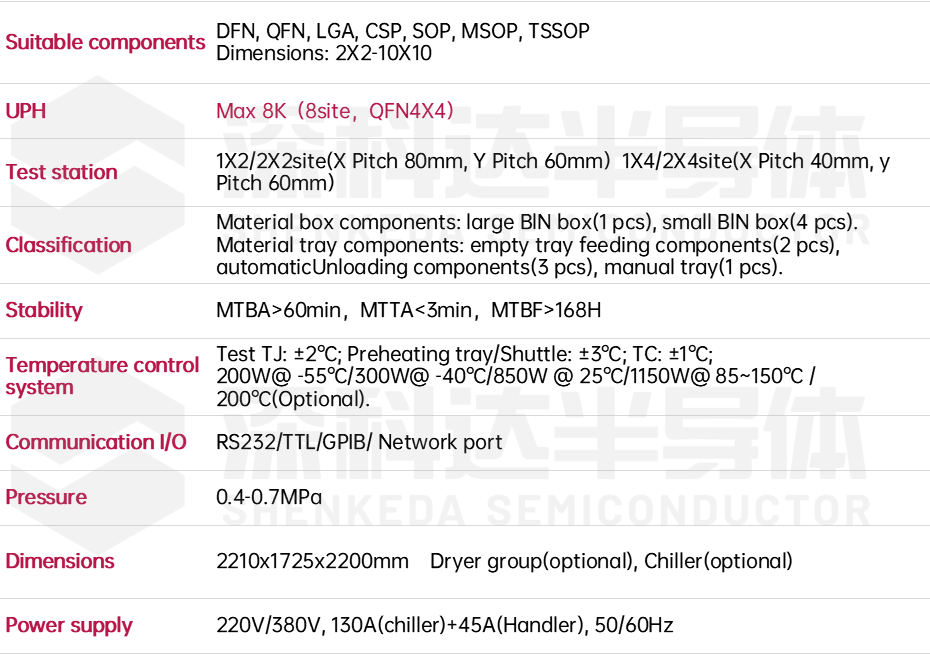 SKD308TB TRI-temperature pick&place test handler is applicable for multi-functional testing and sorting needs to meet customers' diverse testing needs. It is suitable for low/normal/high-temperature testing, sorting, and classification of MSOP/QFN/LGA/BGA/CSP(2X2-10X10 mm), and integrates imaging systems to yield high-quality product output to customers.