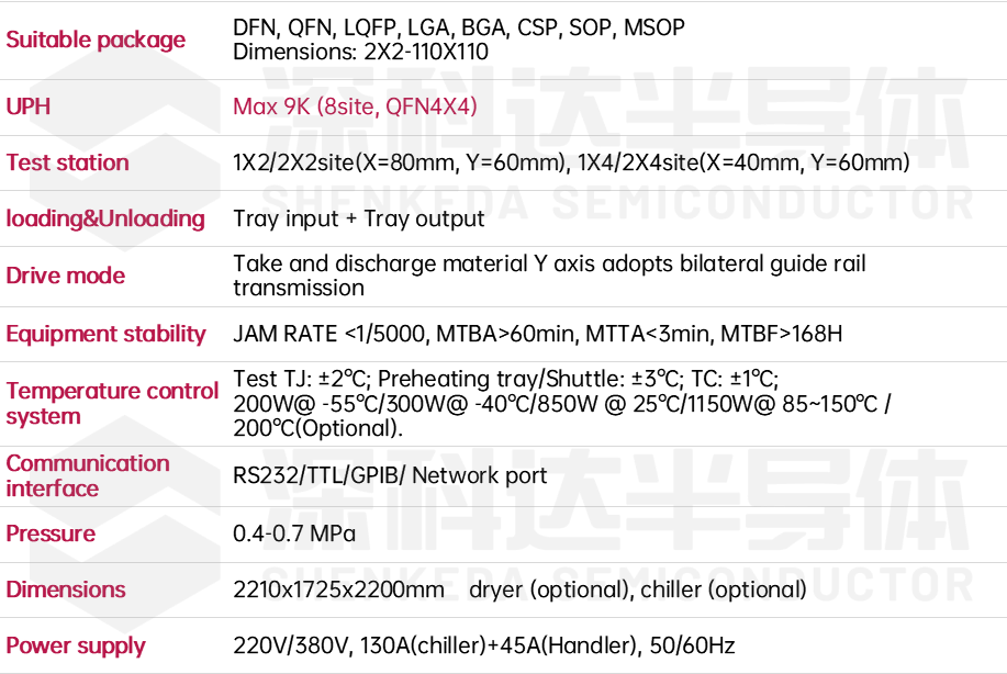 The SKD308T tri-temperature pick and place test handler is suitable for DFN, QFN, LQFP, LGA, BGA, CSP, SOP, MSOP and other product specifications in 2X2-110X110 low temperature/normal temperature/high temperature test and classification requirements. To bring high quality product output to customers.